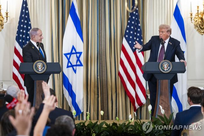 29일(현지시간) 미국 백악관에서 기자회견을 하고 있는 트럼프 대통령과 네타냐후 이스라엘 총리도널드 트럼프 미국 대통령이 베냐민 네타냐후 이스라엘 총리와 공동으로 팔레스타인 무장정파 하마스에 최후…