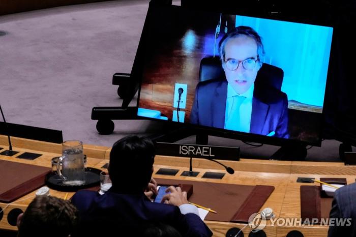 유엔 안전보장이사회에 화상 보고하는 그로시 IAEA 사무총장국제원자력기구(IAEA)가 이스라엘의 이란 핵시설 공습으로 나탄즈 지상 농축시설이 파괴됐다고 공식 확인하면서, 유엔 안전보장이사회가 13일(현…