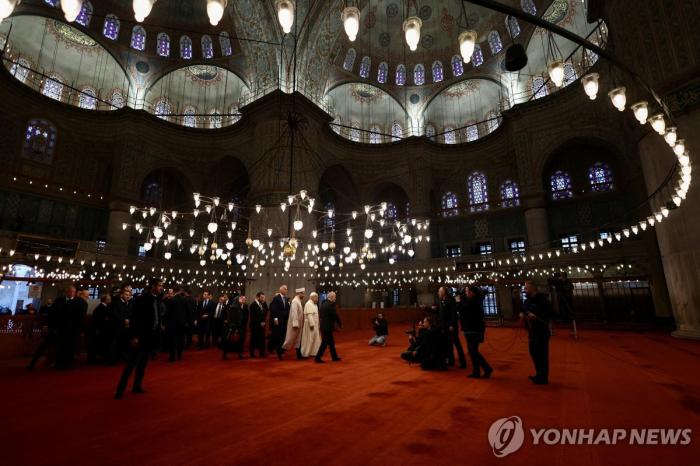 블루 모스크 방문한 레오 14세 교황레오 14세 교황이 29일(현지시간) 이스탄불의 대표적 이슬람 사원 ‘블루 모스크’를 방문하며 종교 간 대화의 신호탄을 다시 올렸다.신발을 벗고 흰 양말 차림으로 모스…