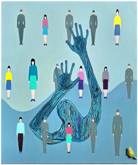 반디의 고발, 20F, mixed media, 2025◈ 작품소개폴란드판 고발의 표지에는 무표정한 마네킹 인간들의 소리 없는 외침이 들린다.억울함에 숨이 막히고 슬픔과 분노로 온몸의 세포들이 절규하고 있으나 힘이 …