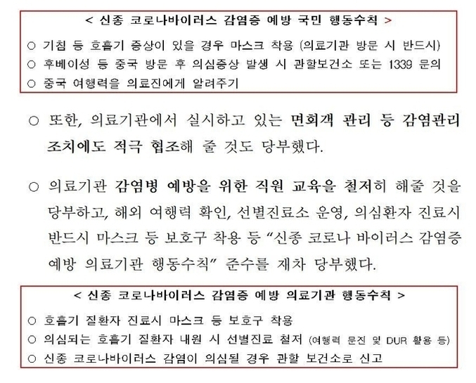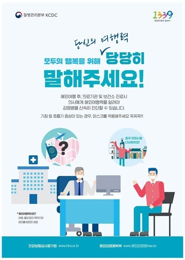 질병관리본부는 중국으로부터 입국 이후 14일 이내에 의심 증상이 발생하는 경우에는 대외 활동을 삼가고, 반드시 관할 보건소, 지역 콜센터(☎지역번호+120), 질병관리본부 상담센터(1339)의 상담을 먼저 받은 뒤 의료기관을 방문해 줄 것을 거듭 강조했다.