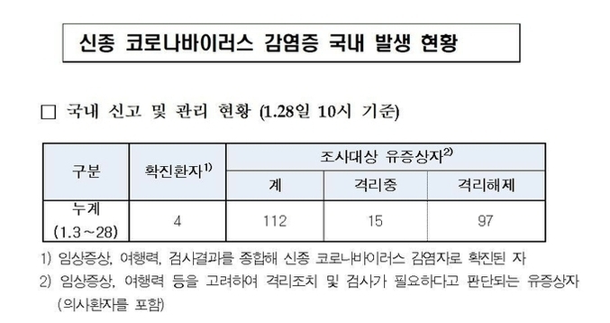 1월 28일 오전 10시 현재 총 116명에게 검사가 이뤄졌고, 4명 확진, 15명은 검사가 진행중이며, 97명은 검사결과 음성으로 확인되어 모두 격리해제 되었다.
