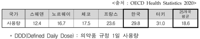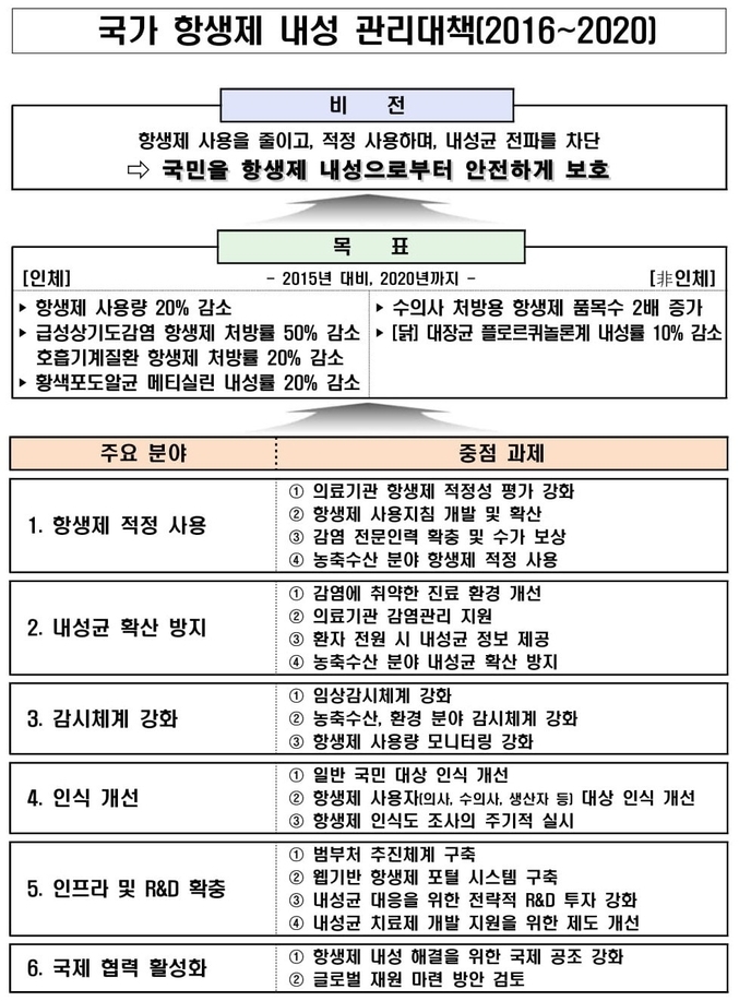 2018년 국내 인체 항생제 사용량(DDD(Defined Daily Dose 의약품 규정 1일 사용량)은 29.8로 OECE 25개국 평균 18.6일보다 높은 수준으로, 우리 정부는 항생제 내성 예방을 위한 국제적 노력에 동참하여 보건의료와 농•축•수산, 식품, 환경 분야를 아우르는 「국가 항생제 내성 관리대책(2016년~2020년)」을 추진하고 있다.