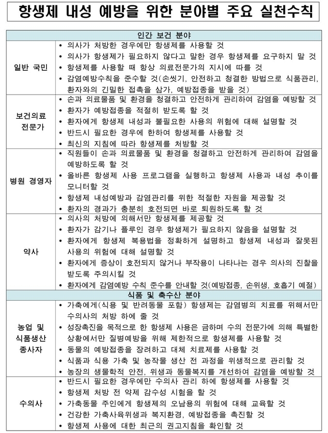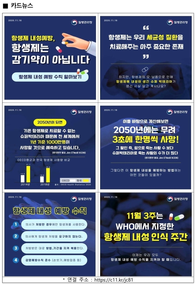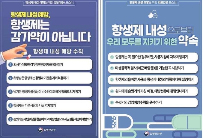 한편, 질병청은 항생제 내성 예방에 대한 수칙 준수 및 실천을 돕고자 홍보물을 제작하여 질병관리청 소셜 채널 및 홈페이지(누리집)을 통해 온라인 등으로 게재할 예정이다. (11월 셋째주)