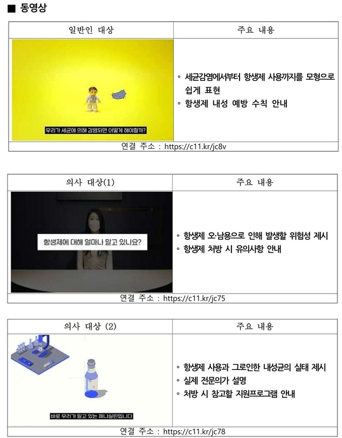 이번 홍보물은 일반인용과 의료인용으로 제작되어 항생제 올바른 처방과 복용 오•남용 등을 주제로 영상물 3편과 항생제 내성 에방 수칙이 담긴 카드 뉴스 및 포스터 등으로 구성되었다.