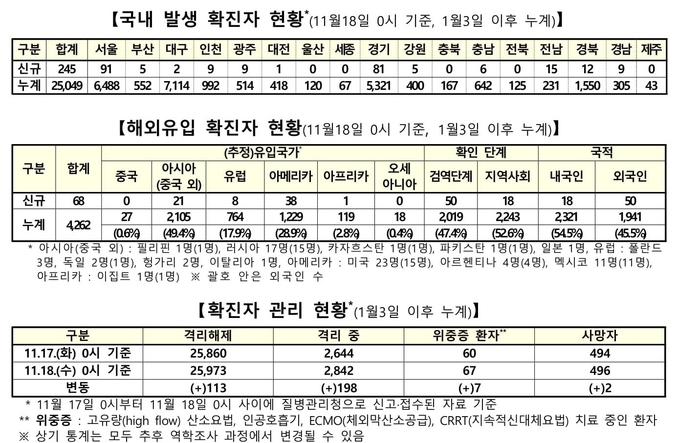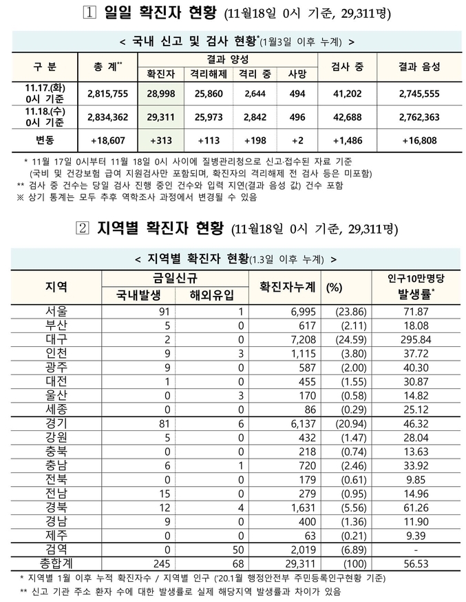 질병관리청 중앙방역대책본부는 11월18일 0시 현재까지 국내 발생 신규 확진 환자는 245명 확인되었고, 해외유입 사례는 68명 확인되어 총 313명 신규 확진 환자가 발생하였다. 이로써 지금까지 총 누적 확진 환자 수는 2만9천311명이라고 밝혔다.