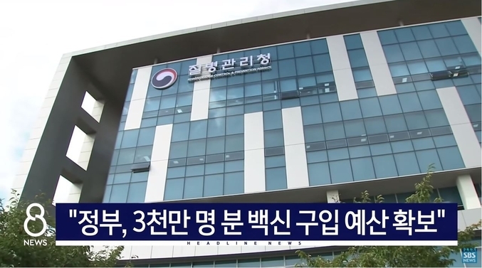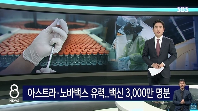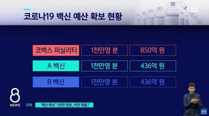 17일 저녁 ‘SBS 8시 뉴스’ 는 “아스트라•노바백스 유력…백신 3천만 명분” 에서 「질병관리청은 우리 국민 60%, 즉 3천만 명분 백신에 대해 선납금 예산 1천723억 원을 확보했으며, 2곳의 외국 회사와 협상 진행 중」 이라고 보도했다.
