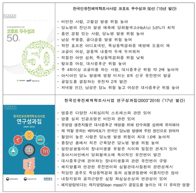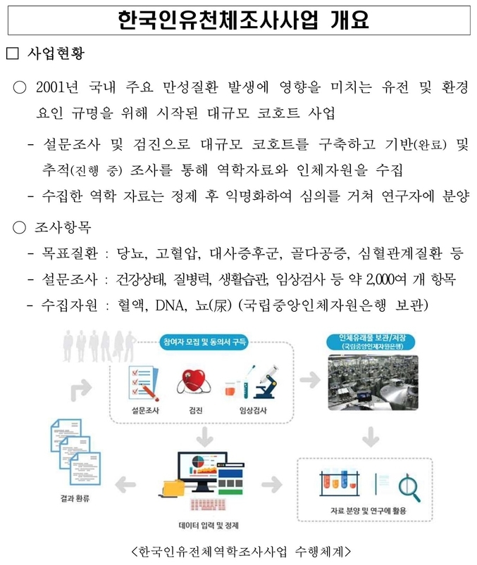 질병관리청 국립보건연구원(원장 권준욱)은 11월20일(금) 한국인 유전체역학조사사업(KoGES) 코호트 수집 자료를 연구 목적으로 추가 공개한다고 밝혔다.