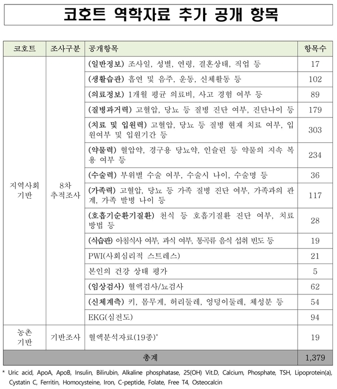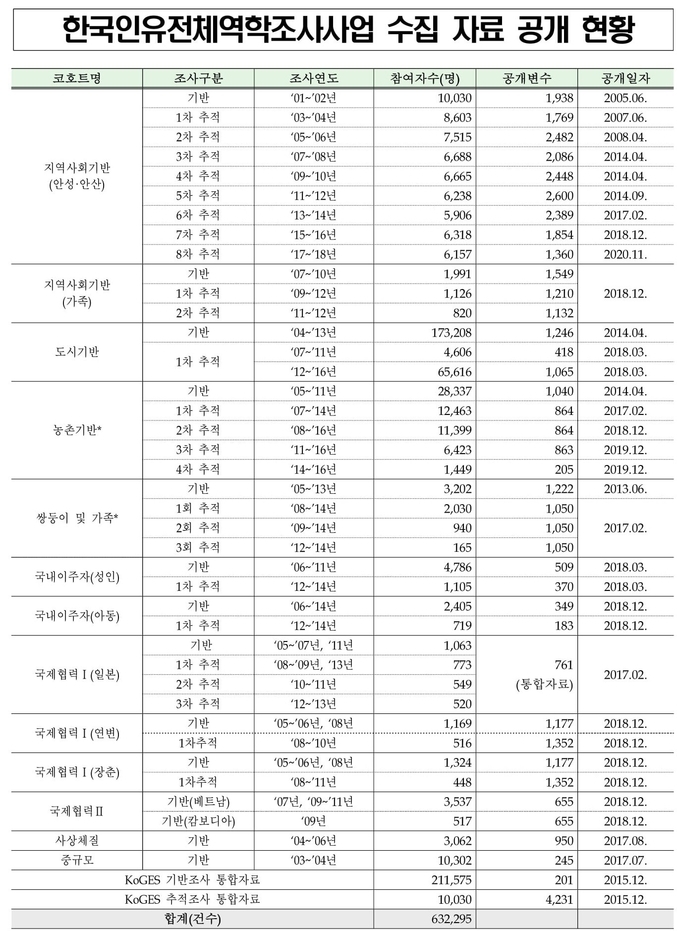 이번에 추가로 공개하는 자료는 지역사회기반 코호트 6천157명분 8차 추적조사자료 1천300여개 변수와 농촌기반 코호트 2만1천265명분 혈액조사 자료 19변수이며, 기존에 공개된 코호트 자료와 함께 질환발생과 생활습관 사이의 연관성 연구 등 다양한 유전체역학 연구에 활용될 전망이다.