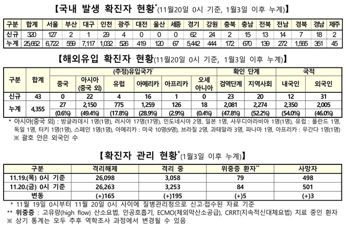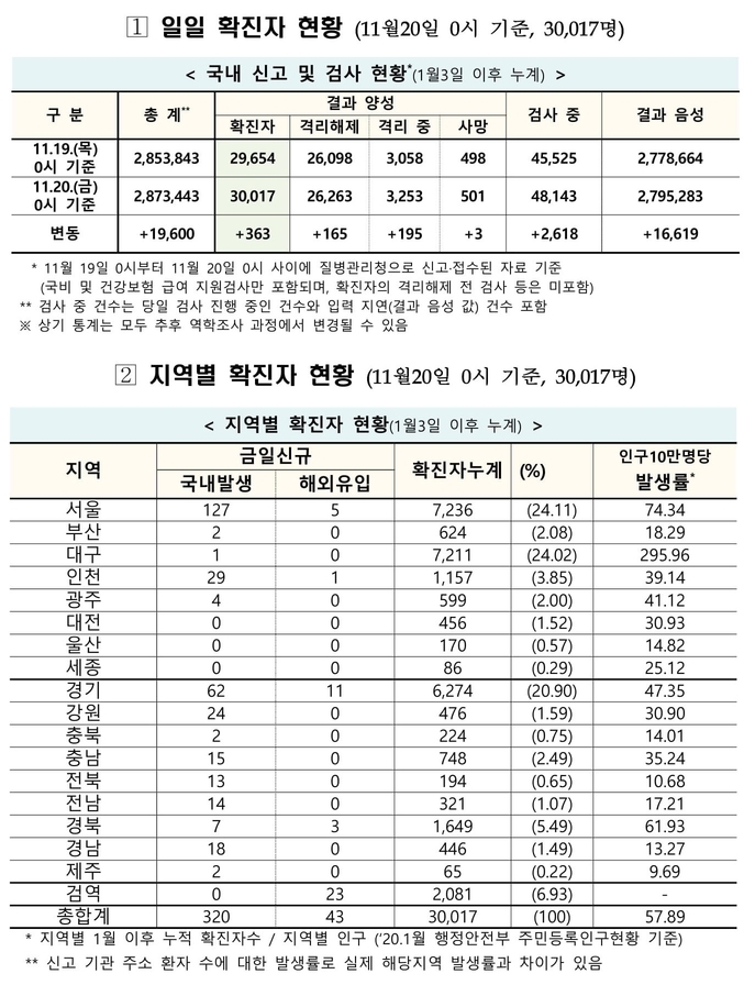 질병관리청 중앙방역대책본부는 11월20일 0시 기준으로 국내 발생 신규 확진 환자는 320명 확인되었고, 해외유입 사례는 43명 확인되어 총 363명 신규 확진 환자가 발생하였다. 이로써 지금까지 총 누적 확진 환자 수는 3만17명이라고 밝혔다.