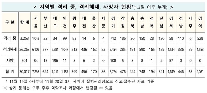 11월20일 0시기준으로 격리 해제된 확진 환자는 전날 165명이 늘어 총 2만6천263명이고, 격리 상태에서 치료 중인 확진 환자는 3천253명이다. 또한, 코로나19 진단검사를 받은 사람은 총 287만3천443명이며, 이 중 279만5천283명이 '음성'으로 확인됐고, 4만8천143명은 검사 중이다.