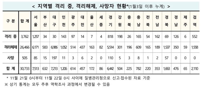 11월22일 0시기준으로 격리 해제된 확진 환자는 전날 101명이 늘어 총 2만6천466명이고, 격리 상태에서 치료 중인 확진 환자는 3천762명이다. 또한, 코로나19 진단검사를 받은 사람은 총 290만8천890명이며, 이 중 282만4천128명이 '음성'으로 확인됐고, 5만4천29명은 검사 중이다.
