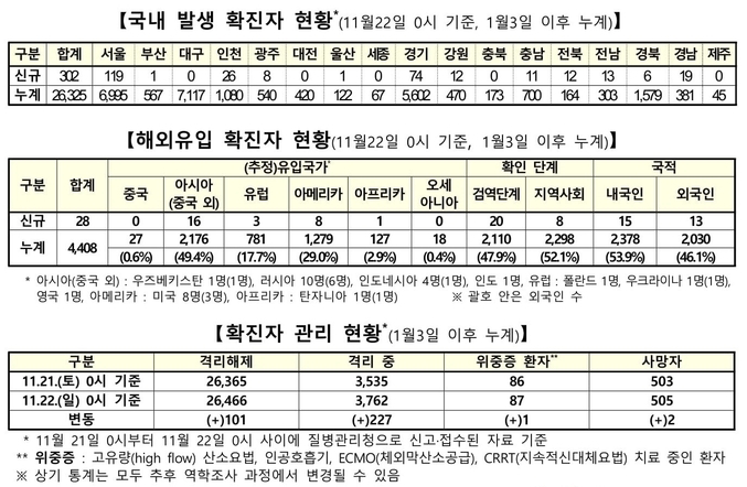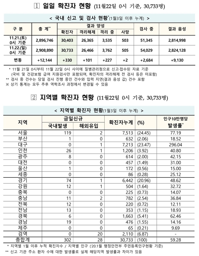 질병관리청 중앙방역대책본부는 11월22일 0시 기준으로 국내 발생 신규 확진 환자는 302명 확인되었고, 해외유입 사례는 28명 확인되어 총 330명 신규 확진 환자가 발생하였다. 이로써 지금까지 총 누적 확진 환자 수는 3만733명이라고 밝혔다.