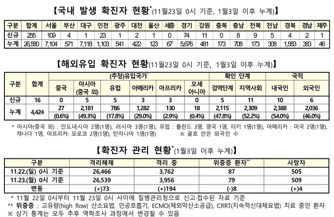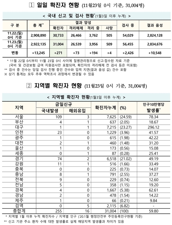 질병관리청 중앙방역대책본부는 11월23일 0시 기준으로 국내 발생 신규 확진 환자는 255명 확인되었고, 해외유입 사례는 16명 확인되어 총 271명 신규 확진 환자가 발생하였다. 이로써 지금까지 총 누적 확진 환자 수는 3만1천4명이라고 밝혔다.