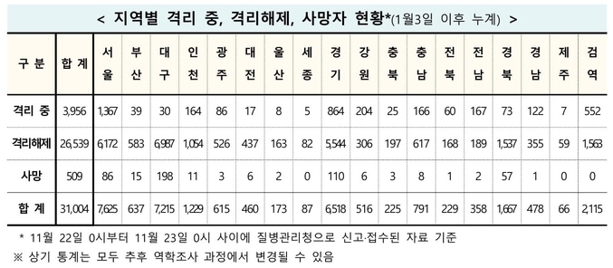 11월23일 0시기준으로 격리 해제된 확진 환자는 전날 73명이 늘어 총 2만6천539명이고, 격리 상태에서 치료 중인 확진 환자는 3천956명이다. 또한, 코로나19 진단검사를 받은 사람은 총 292만2천135명이며, 이 중 283만4천676명이 '음성'으로 확인됐고, 5만6천455명은 검사 중이다.