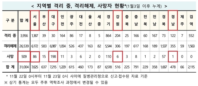 한편 본보(本報) 509명 사망자 정리 중 질병청과 차이가 나는 곳은 2곳이다. 본보(本報)는 서울 87명 사망, 충남 7명 사망이지만 질병청은 서울 86명, 충남 8명이다. 이는 앞서 사망자 이력 발표에서 지역 발표 오류로 판단되고 있다. 향후 정정할 부분이 있으면 안내 후 정정할 예정이다.