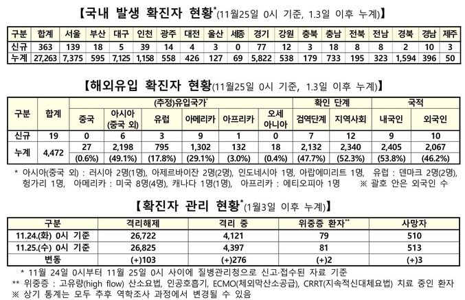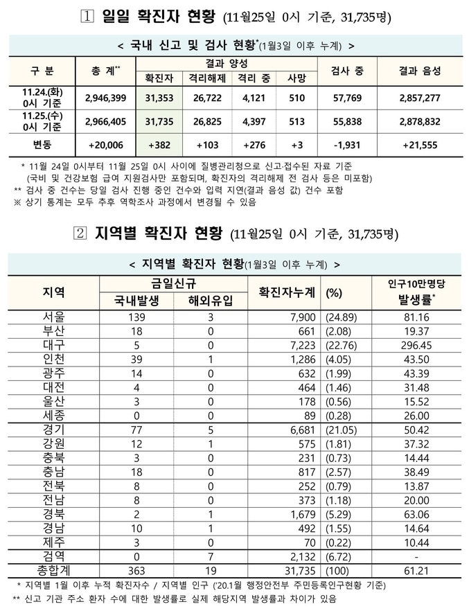 질병관리청 중앙방역대책본부는 11월25일 0시 기준으로 국내 발생 신규 확진 환자는 363명 확인되었고, 해외유입 사례는 19명 확인되어 총 382명 신규 확진 환자가 발생하였다. 이로써 지금까지 총 누적 확진 환자 수는 3만1천735명이라고 밝혔다.