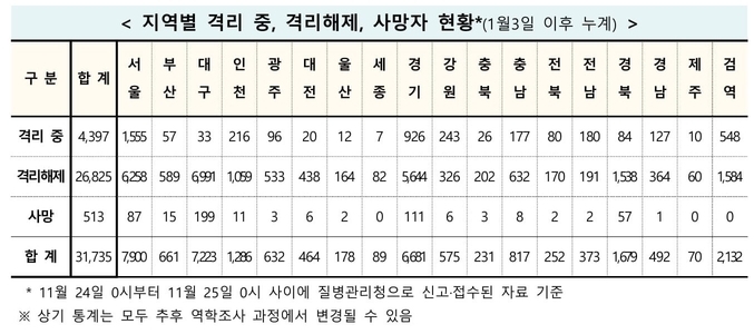 11월25일 0시기준으로 격리 해제된 확진 환자는 전날 103명이 늘어 총 2만6천825명이고, 격리 상태에서 치료 중인 확진 환자는 4천397명이다. 또한, 코로나19 진단검사를 받은 사람은 총 296만6천405명이며, 이 중 287만8천832명이 '음성'으로 확인됐고, 5만5천838명은 검사 중이다.