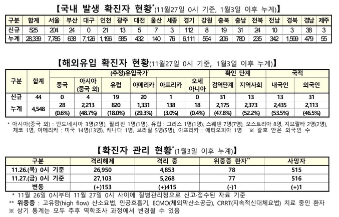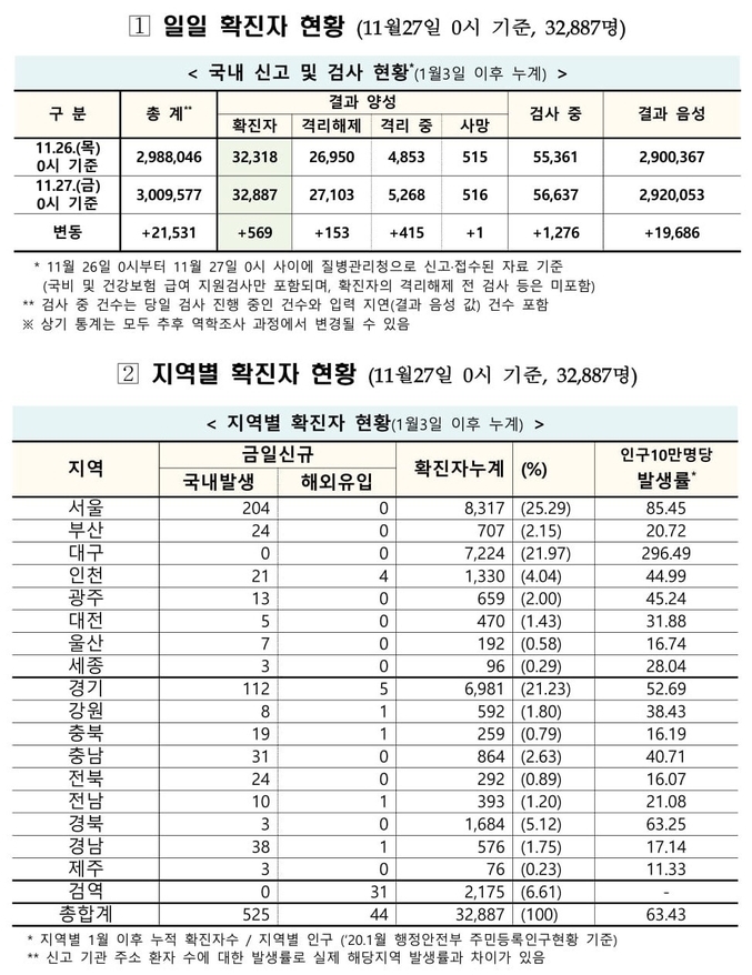 질병관리청 중앙방역대책본부는 11월27일 0시 기준으로 국내 발생 신규 확진 환자는 525명 확인되었고, 해외유입 사례는 44명 확인되어 총 569명 신규 확진 환자가 발생하였다. 이로써 지금까지 총 누적 확진 환자 수는 3만2천887명이라고 밝혔다.