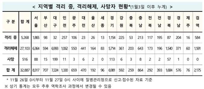 11월27일 0시기준으로 격리 해제된 확진 환자는 전날 153명이 늘어 총 2만7천103명이고, 격리 상태에서 치료 중인 확진 환자는 5천268명이다. 또한, 코로나19 진단검사를 받은 사람은 총 300만9천577명이며, 이 중 292만53명이 '음성'으로 확인됐고, 5만6천637명은 검사 중이다.