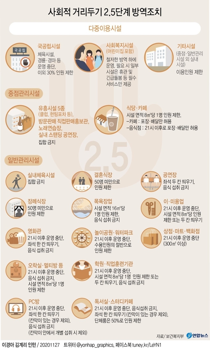 방역당국은 최근 확산세를 잡는 동시에 5일 앞으로 다가온 대학수학능력시험(12월3일)을 고려해 29일 ‘사회적 거리두기’ 단계 격상을 논의할 예정이다.