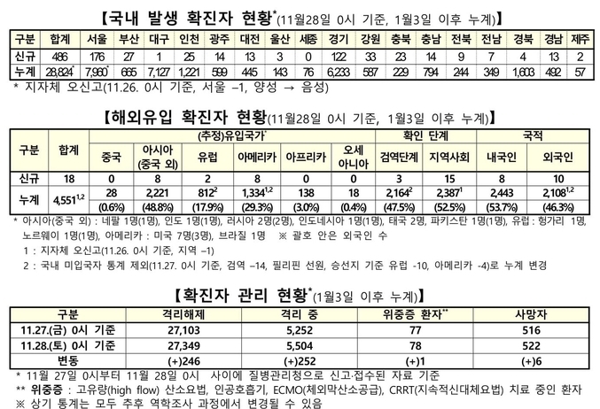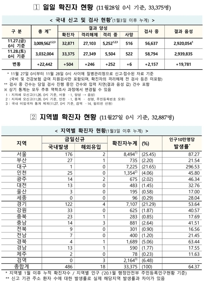 질병관리청 중앙방역대책본부는 11월28일 0시 기준으로 국내 발생 신규 확진 환자는 486명 확인되었고, 해외유입 사례는 18명 확인되어 총 504명 신규 확진 환자가 발생하였다. 이로써 지금까지 총 누적 확진 환자 수는 3만3천375명이라고 밝혔다.
