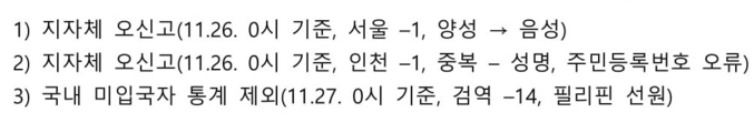 이어 해외 유입은 4천551명(11월26일 0시 기준 지자체 오신고로 (-1명), 11월27일 0시 기준 검역 (-14명)-필리핀 선원, 승선지 기준 유럽 -10명, 아메리카 -4명로 누계)이며 이중 내국인이 2천443명(53.68%)이다. 신규 격리해제자는 246명으로 총 2만7천349명(81.95%)이라고 발표했다. (해외유입 4천551명은 조사가 완료되어 해외유입으로 확인된 사례이다.)