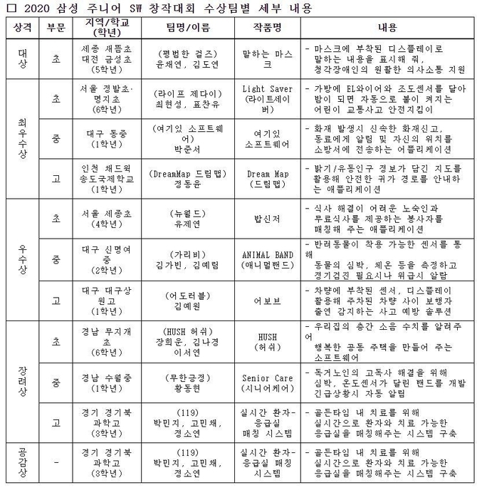 한편 삼성 주니어 SW 창작대회는 지난 2015년부터 올해까지 초•중•고등학생 3만1천여 명이 참가했으며, 미래 SW 인재 양성을 위한 축제 역할을 담당하고 있다는 평을 듣고 있다.
