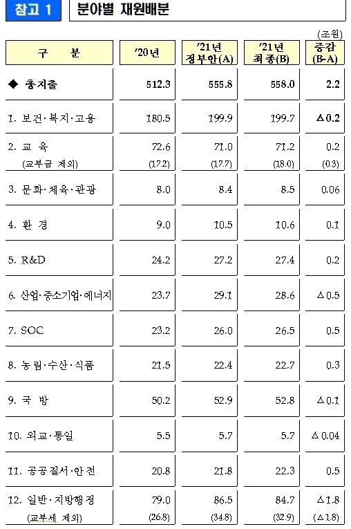 변화의 원인은 당연히 신종 코로나바이러스 감염증(코로나19)이다. 예산안 제출 이후 코로나19 3차 확산 상황이 발생하면서 피해를 입은 국민에 대한 지원이 불가피해졌고, 코로나19 백신 개발이 구체화되면서 구입비 예산이 필요해진 것도 예산안을 큰 폭으로 수정할 수밖에 없는 사유가 됐다.