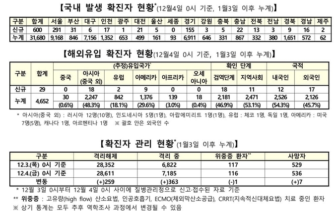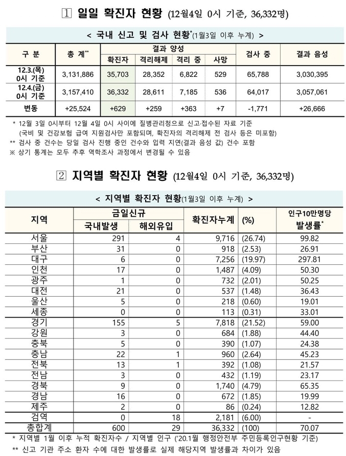 질병관리청 중앙방역대책본부는 12월4일 0시 기준으로 국내 발생 신규 확진 환자는 600명 확인되었고, 해외유입 사례는 29명 확인되어 총 629명 신규 확진 환자가 발생하였다. 이로써 지금까지 총 누적 확진 환자 수는 3만6천332명이라고 밝혔다.