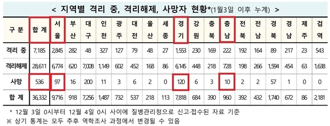 한편 본보(本報) 536명 사망자 정리 중 질병청과 차이가 나는 곳은 2곳이다. 본보(本報)는 서울 98명 사망, 충남 9명 사망이지만 질병청은 서울 99명, 충남 10명이다. 이는 앞서 사망자 이력 발표에서 지역 발표 오류로 판단되고 있다. 향후 정정할 부분이 있으면 안내 후 정정할 예정이다.