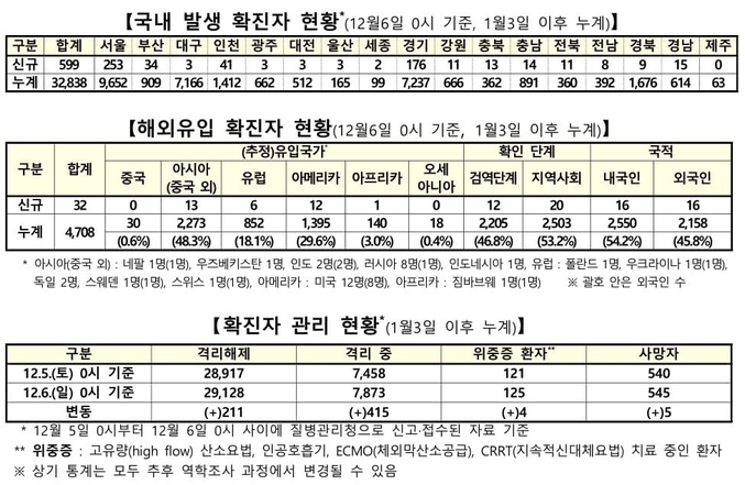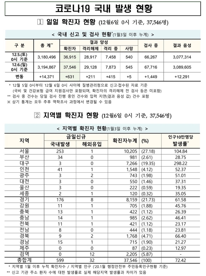 질병관리청 중앙방역대책본부는 12월6일 0시 기준으로 국내 발생 신규 확진 환자는 599명 확인되었고, 해외유입 사례는 32명 확인되어 총 631명 신규 확진 환자가 발생하였다. 이로써 지금까지 총 누적 확진 환자 수는 3만7천546명이라고 밝혔다.