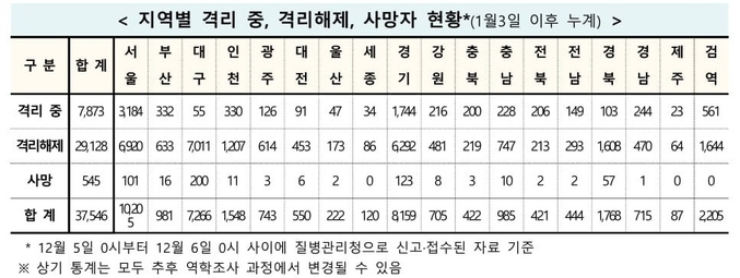 12월6일 0시 기준으로 지역별 누적 확진 환자 수는 서울 1만205명, 경기 8천159명, 대구 7천266명, 경북 1천768명, 인천 1천548명이다.