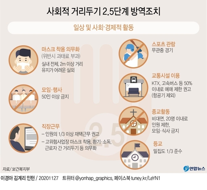 정부는 이날 오후 3시 정부서울청사에서 정세균 국무총리 주재로 중앙재난안전대책본부 회의를 열어 사회적거리두기 강화 방안을 논의한다. 수도권의 경우 '2단계+α' 조치 연장 대신 2.5단계로 격상하는 방안에 무게가 실려 있는 것으로 알려졌다.