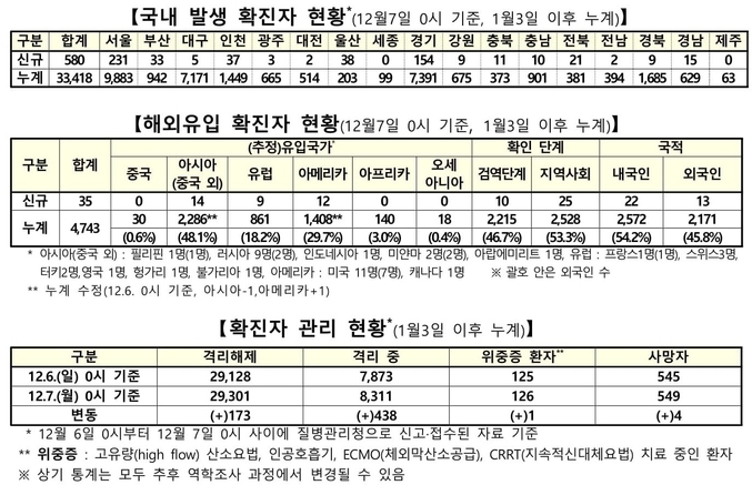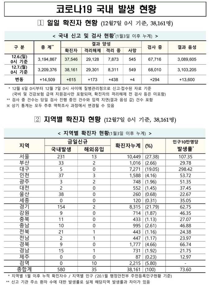질병관리청 중앙방역대책본부는 12월7일 0시 기준으로 국내 발생 신규 확진 환자는 580명 확인되었고, 해외유입 사례는 35명 확인되어 총 615명 신규 확진 환자가 발생하였다. 이로써 지금까지 총 누적 확진 환자 수는 3만8천161명이라고 밝혔다.