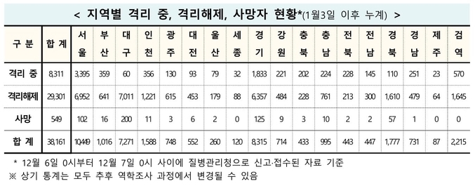 12월7일 0시기준으로 격리 해제된 확진 환자는 전날 173명이 늘어 총 2만9천301명이고, 격리 상태에서 치료 중인 확진 환자는 8천311명이다. 또한, 코로나19 진단검사를 받은 사람은 총 320만9천376명이며, 이 중 310만3천205명이 '음성'으로 확인됐고, 6만8천10명은 검사 중이다.
