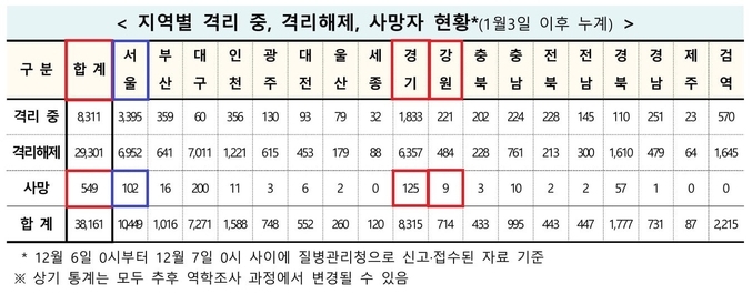 한편 본보(本報) 549명 사망자 정리 중 질병청과 차이가 나는 곳은 2곳이다. 본보(本報)는 서울 103명 사망, 충남 9명 사망이지만 질병청은 서울 102명, 충남 10명이다. 이는 앞서 사망자 이력 발표에서 지역 발표 오류로 보여진다. 향후 정정할 부분이 있으면 안내 후 정정할 예정이다.