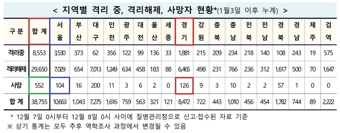 한편 본보(本報) 552명 사망자 정리 중 질병청과 차이가 나는 곳은 2곳이다. 본보(本報)는 서울 105명 사망, 충남 9명 사망이지만 질병청은 서울 104명(상기 파란 네모 참조), 충남 10명이다. 이는 앞서 사망자 이력 발표에서 지역 발표 오류로 판단되고 있다. 향후 정정할 부분이 있으면 안내 후 정정할 예정이다.