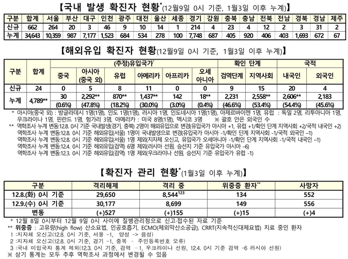 질병관리청 중앙방역대책본부(중대본)는 12월9일 0시 기준으로 국내 발생 신규 확진 환자가 662명 확인되었고, 해외 유입이 24명으로 총 686명의 신규 확진 환자가 발생하였다고 밝혔다. 이로써 지금까지 총 누적 확진 환자 수는 3만9천432명에 이른다. 신규 격리해제자는 527명으로, 총 3만177명(76.53%)이다.