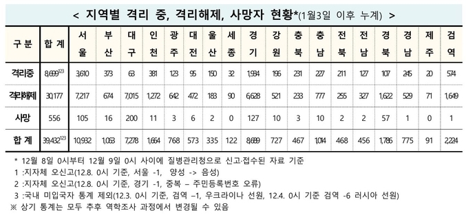 12월9일 0시기준으로 격리 해제된 확진 환자는 전날 527명이 늘어 총 3만177명이고, 격리 상태에서 치료 중인 확진 환자는 8천699명이다. 또한, 코로나19 진단검사를 받은 사람은 총 325만3천236명이며, 이 중 313만8천724명이 '음성'으로 확인됐고, 7만5천80명은 검사 중이다.