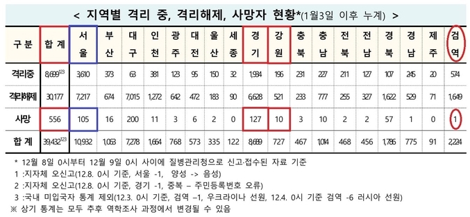 한편 본보(本報) 556명 사망자 정리 중 질병청과 차이가 나는 곳은 2곳이다. 본보(本報)는 서울 106명 사망, 충남 9명 사망이지만 질병청은 서울 105명, 충남 10명이다. 이는 앞서 사망자 이력 발표에서 지역 발표 오류로 판단되고 있다. 향후 정정할 부분이 있으면 안내 후 정정할 예정이다.