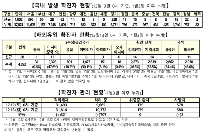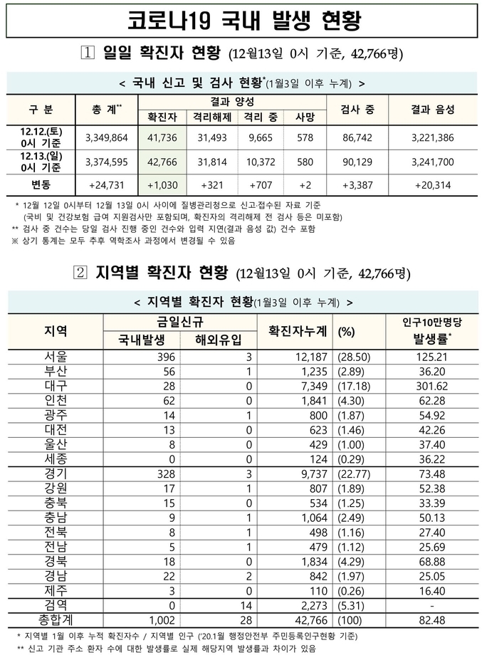 질병관리청 중앙방역대책본부(중대본)는 12월13일 0시 기준으로 국내 발생 신규 확진 환자는 1천2명 확인되었고, 해외유입 사례는 28명 확인되어 총 1천30명 신규 확진 환자가 발생하였다. 이로써 지금까지 총 누적 확진 환자 수는 4만2천766명이라고 밝혔다.
