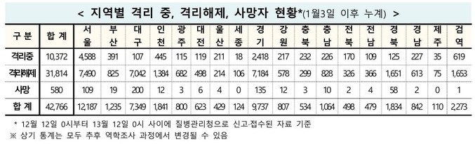 12월13일 0시 기준으로 지역별 누적 확진 환자 수는 서울 1만2천187명, 경기 9천737명, 대구 7천349명, 인천 1천841명, 경북 1천834명, 부산 1천235명, 충남 1천64명이다.