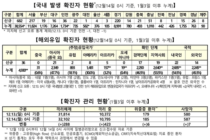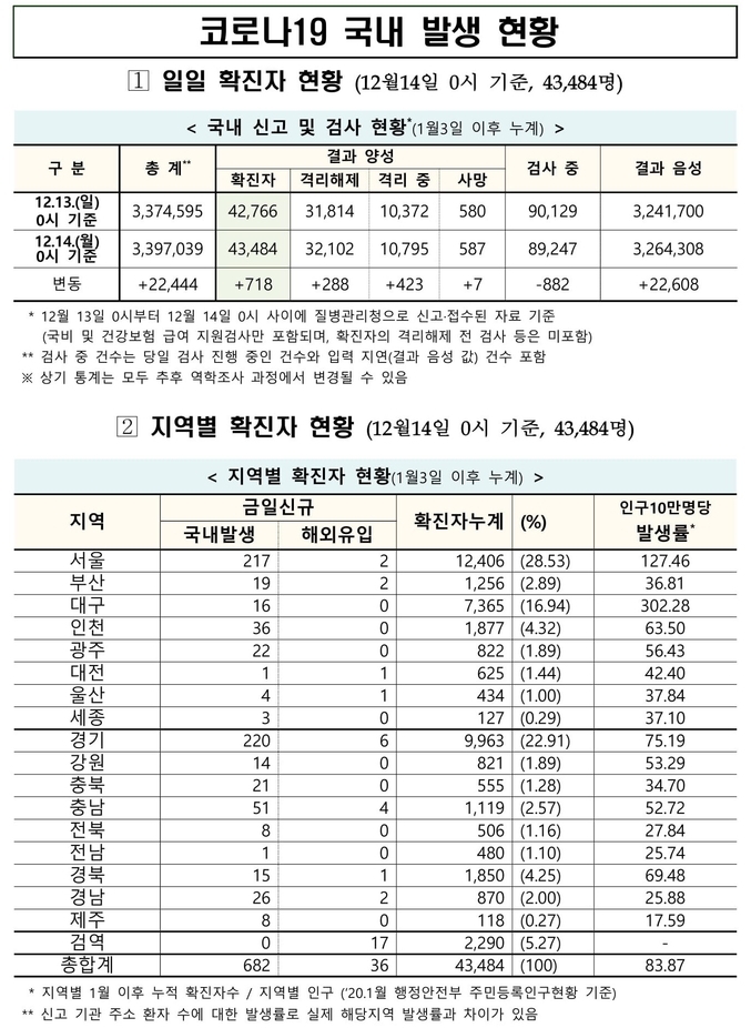 질병관리청 중앙방역대책본부(중대본)는 12월14일 0시 기준으로 국내에서 682명, 해외유입 사례 36명 등 총 718명의 신규 확진 환자가 발생하여 지금까지 코로나19 누적 확진 환자 수가 4만3천484명이라고 밝혔다.