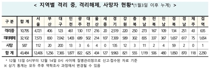 12월14일 0시 기준으로 지역별 누적 확진 환자 수는 서울 1만2천406명, 경기 9천963명, 대구 7천365명, 인천 1천877명, 경북 1천850명, 부산 1천256명, 충남 1천119명이다.