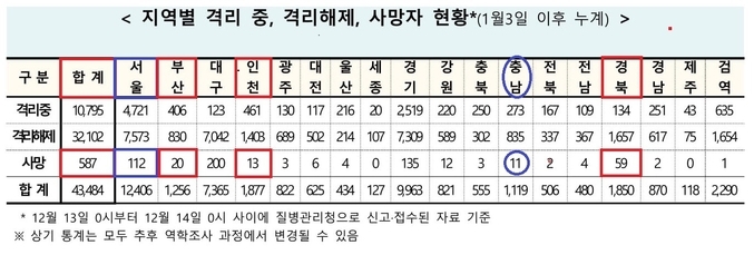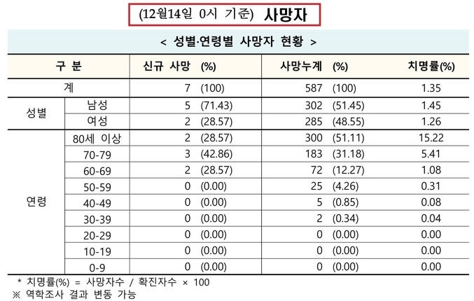 현재까지 국내 총 사망자는 587명이다. (12월14일 0시 기준)