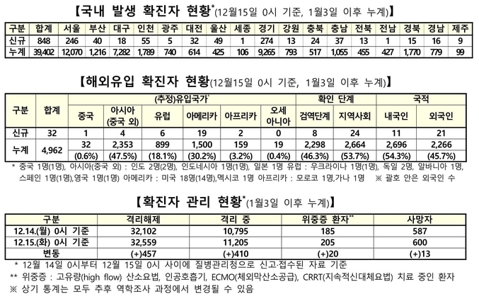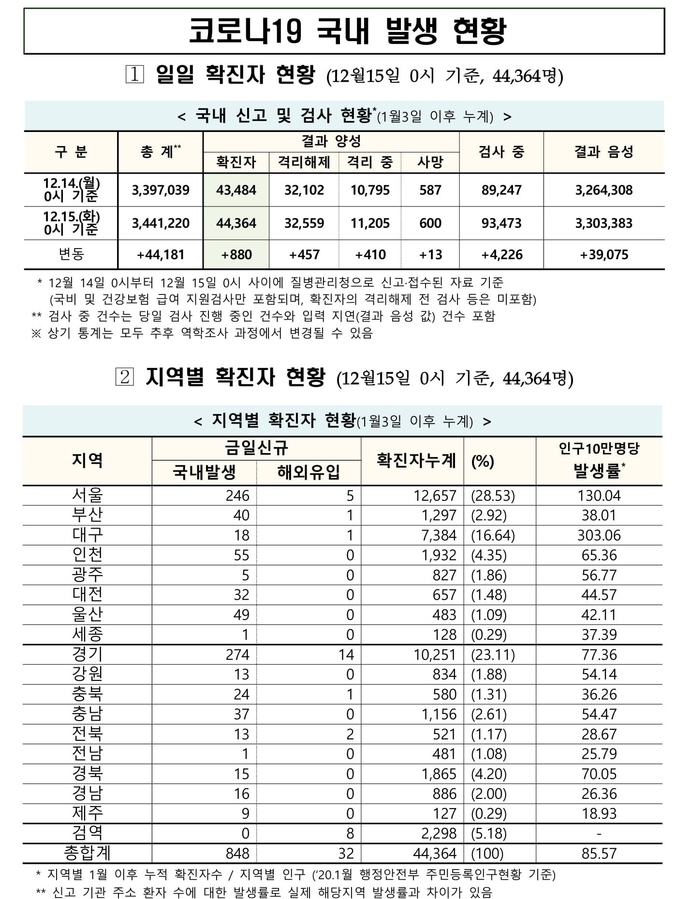 질병관리청 중앙방역대책본부(중대본)는 12월15일 0시 기준으로 국내 발생 신규 확진 환자는 848명 확인되었고, 해외유입 사례는 32명 확인되어 총 880명 신규 확진 환자가 발생되어 지금까지 총 누적 확진 환자 수는 4만4천364명이라고 밝혔다.