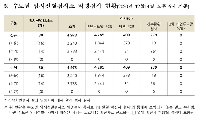 여기에다 전날부터 수도권 임시 선별검사소에서 시행된 4천973건의 선제 검사 건수까지 더하면 실제 검사 건수는 더 늘어난다. (다만 수도권 임시 선별검사소에서 확진 된 사례는 코로나19 확진 환자로 신고되어 일일 확진 환자 현황에 포함되었음)
