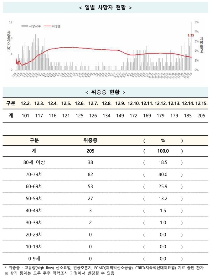 국내 평균 치명률은 1.35%다. 연령대별 치명률은 60대 1.09%, 70대 5.34%, 80세 이상 15.02% 등으로 고령일수록 치명률이 아주 높게 나타난다.