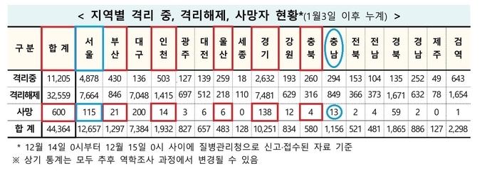한편 본보(本報) 600명 사망자 정리 중 질병청과 차이가 나는 곳은 2곳이다. 본보(本報)는 서울 116명 사망, 충남 12명 사망이지만 질병청은 서울 115명(표 파란 네모 박스), 충남 13명(표 파란 원모양 참조)이다. 이는 앞서 사망자 이력 발표에서 지역 발표 오류로 판단되고 있다. 향후 정정할 부분이 있으면 안내 후 정정할 예정이다.